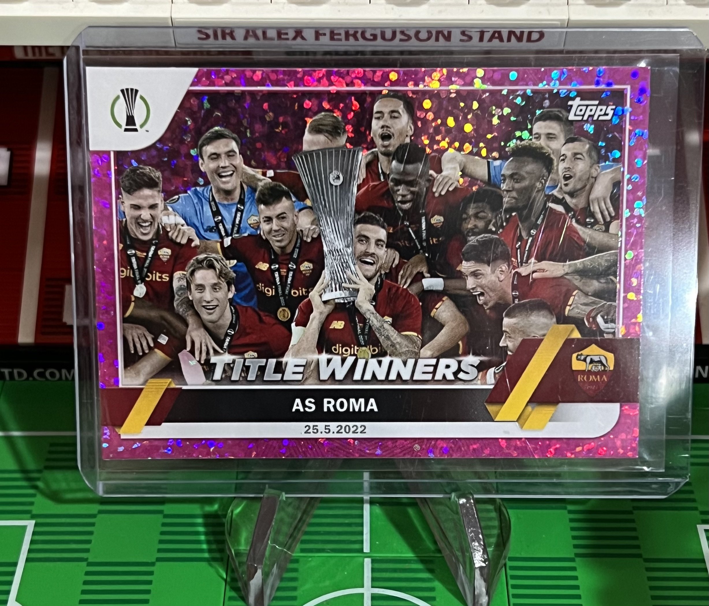 Description: AS Roma Title Winners Pink Sparkle Parallel card from the 2023 Topps UEFA Club Competitions Card collection.