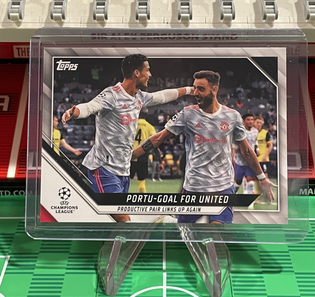 A collection of Manchester United cards from the 2022 Topps UEFA Champions League collection. Name: Cristiano Ronaldo Manufacture: Topps Number: 100 Year: 2022 Description: Cristiano Ronaldo card from the Topps …