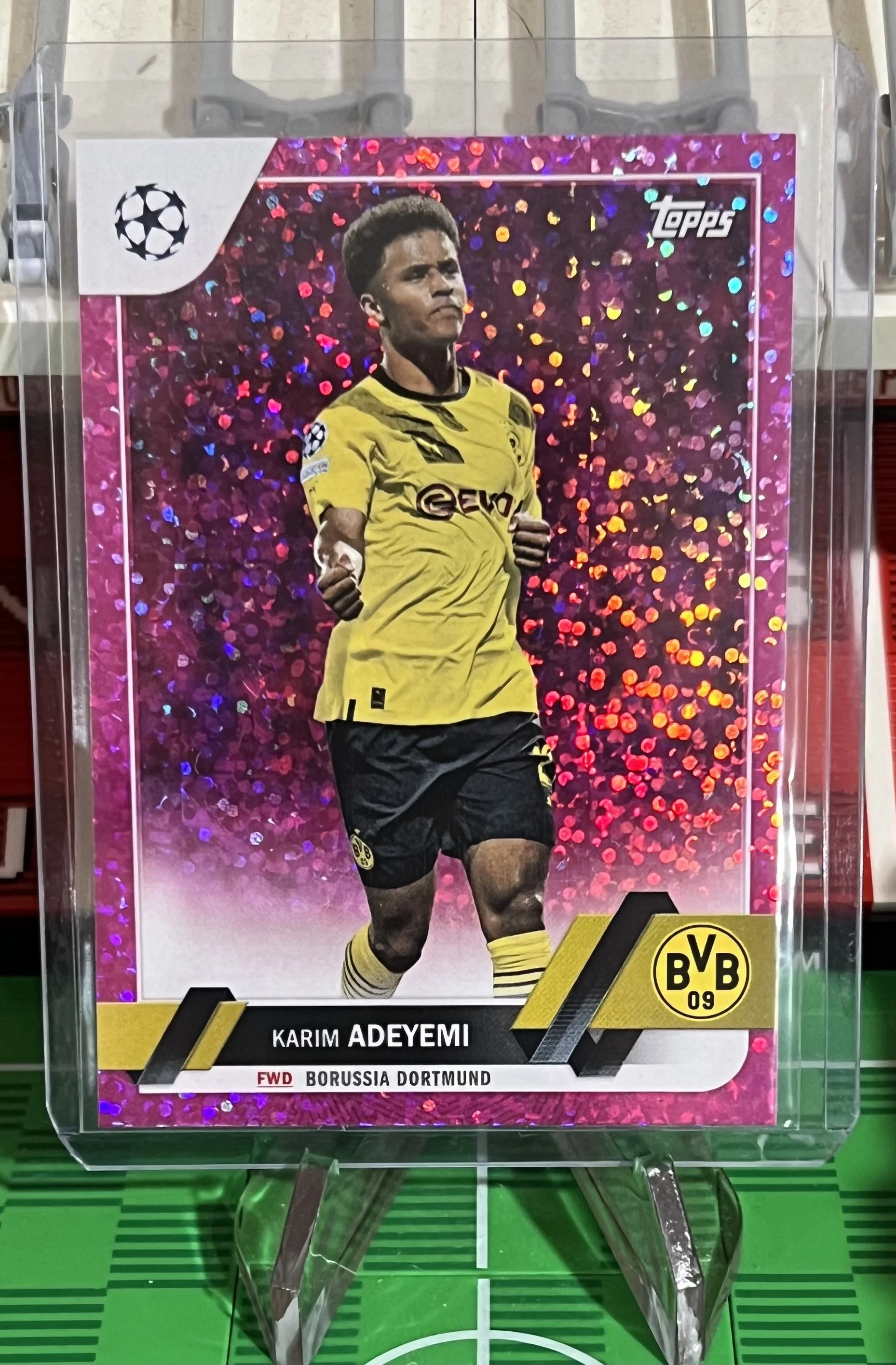 Description: Karim Adeyemi pink sparkle parallel card from the 2023 Topps UEFA Club Competitions Card collection