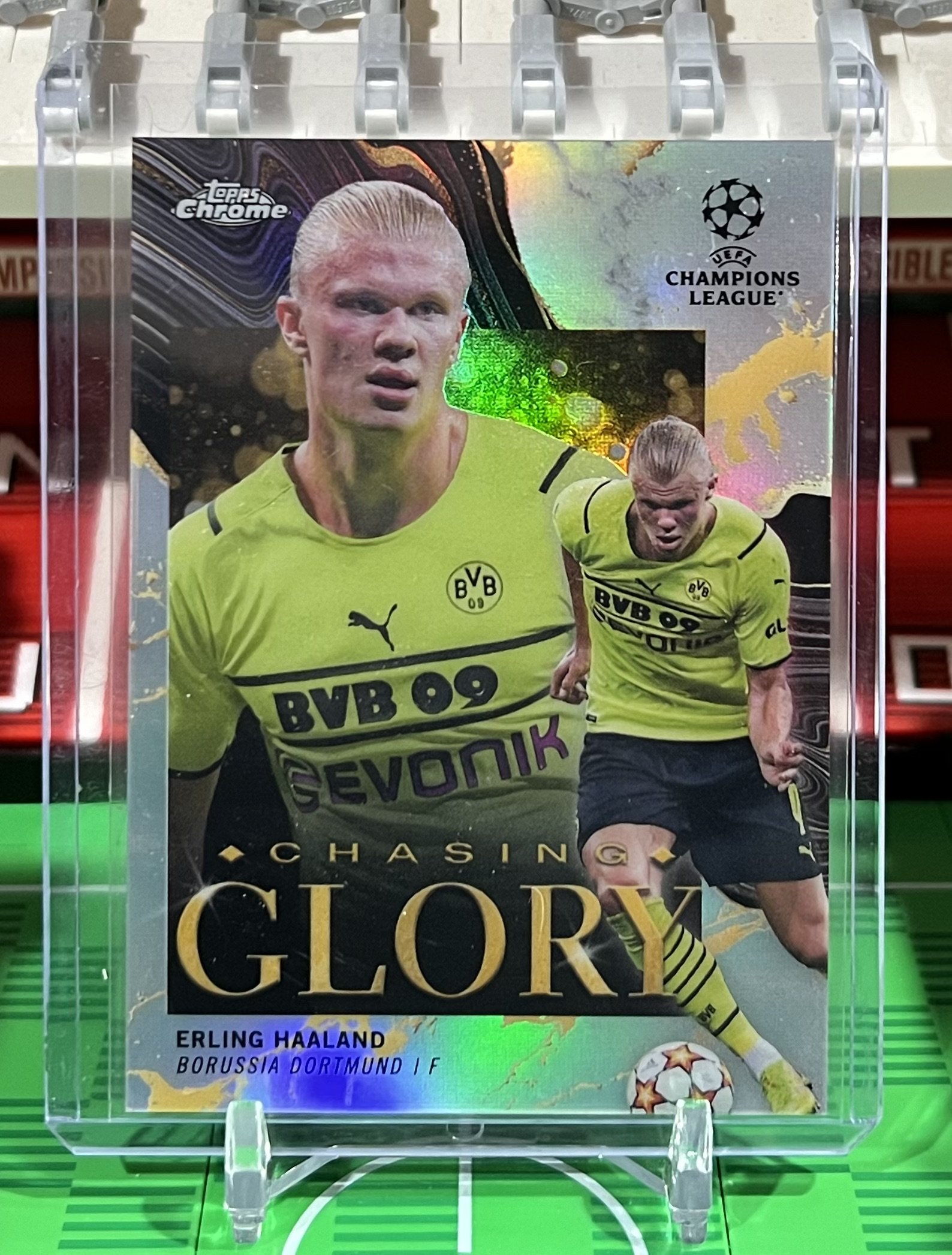 Description: Erling Haaland Chasing Glory card from the Topps Chrome UEFA Club Competition collection
