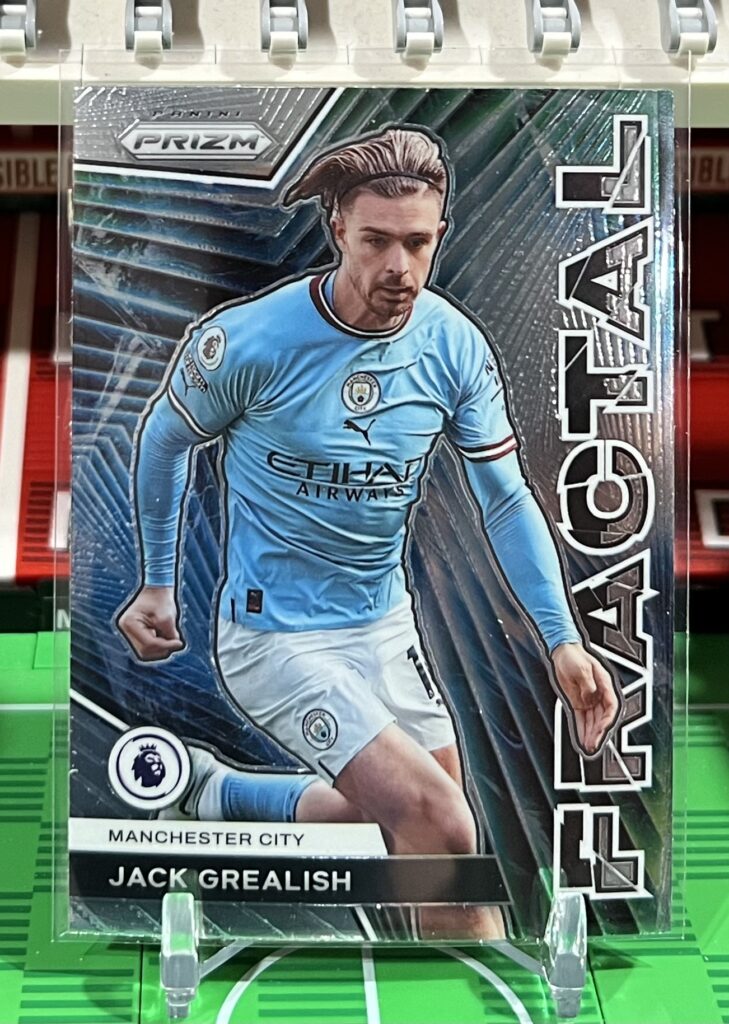 A collection of Manchester City 2022-23 Panini Premier League Prizm cards including a Jack Grealish Fractal card, Julian Alvarez rookie card, Rico Lewis rookie card, and Erling Haaland signed card.