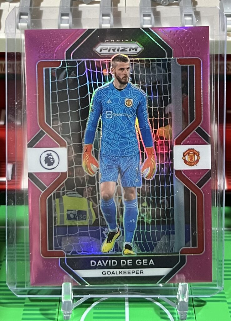 Description: David De Gea Pink Parallel card numbered 100/199 from the 2022-23 Panini Prizm collection