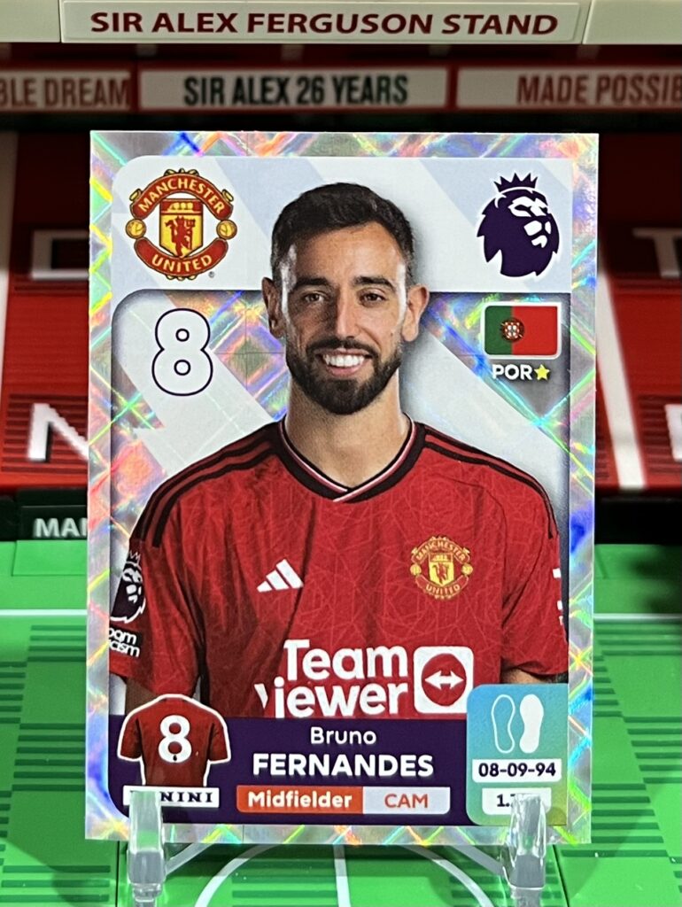 Description: Bruno Fernandes foil sticker from the 2024 Panini Premier League sticker collection