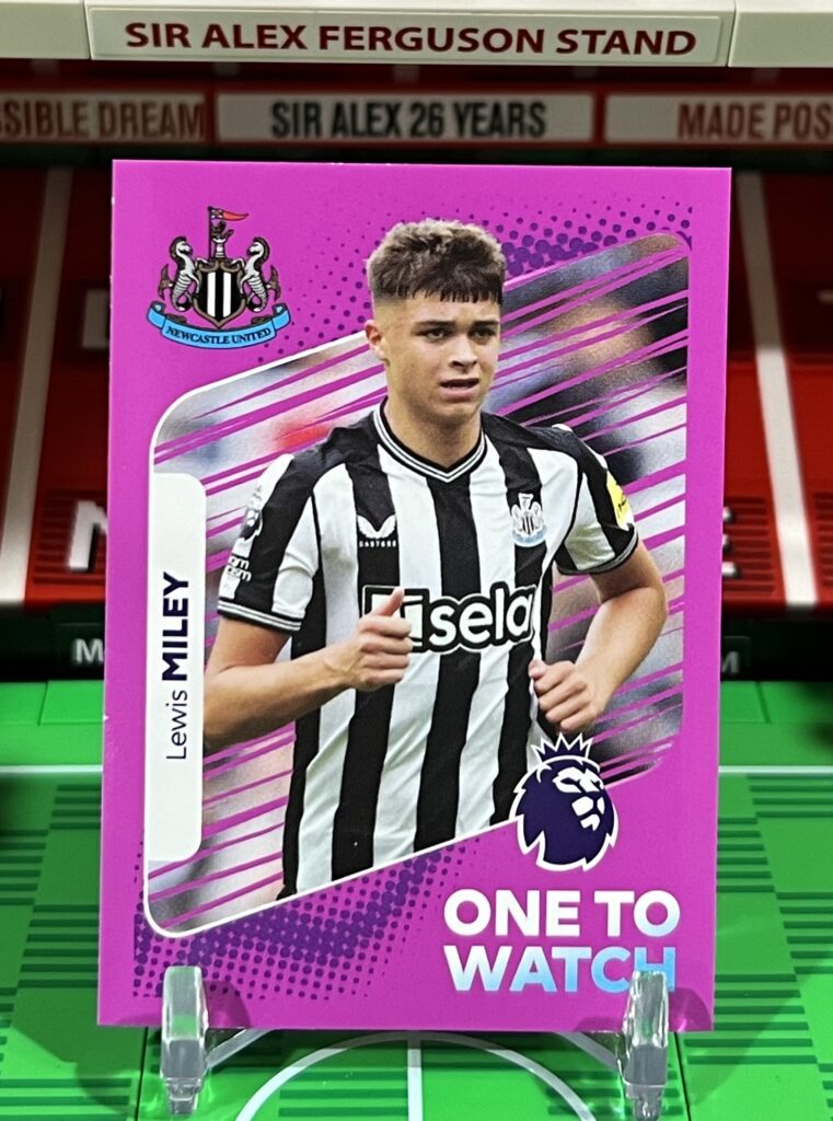 Description: Lewis Miley One To Watch sticker from the 2024 Panini Premier League sticker collection. This is also a Lewis Miley rookie card