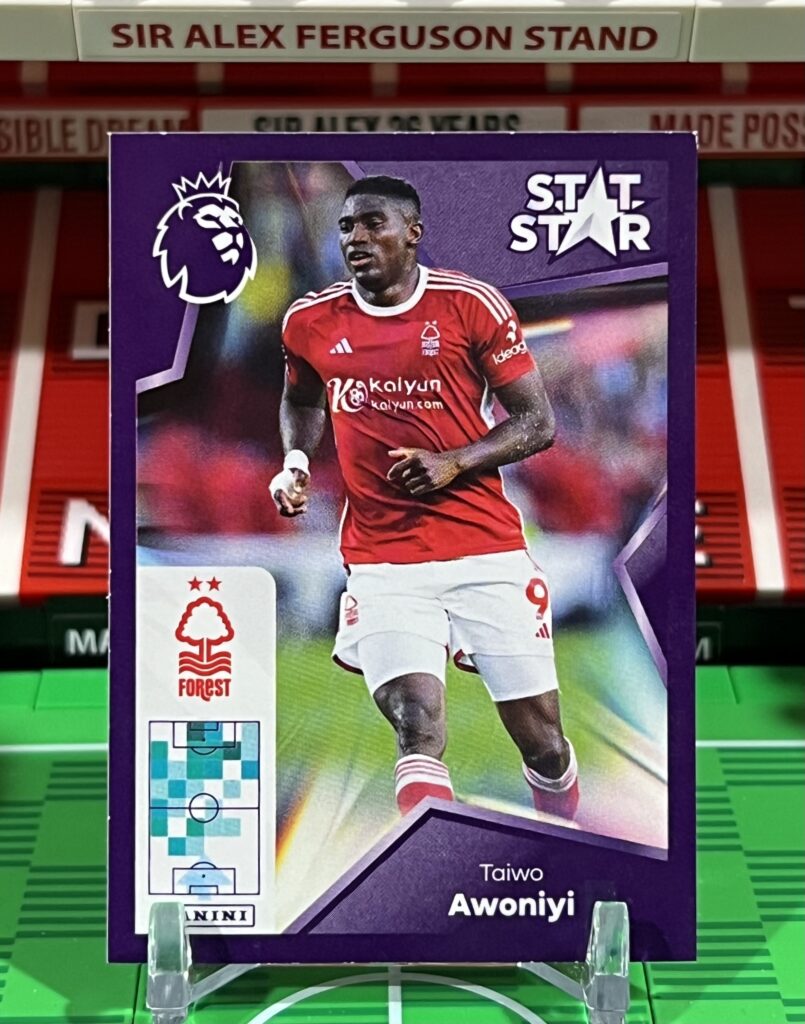 Description: Taiwo Awoniyi Stat Star sticker from the 2024 Panini English Premier League sticker collection