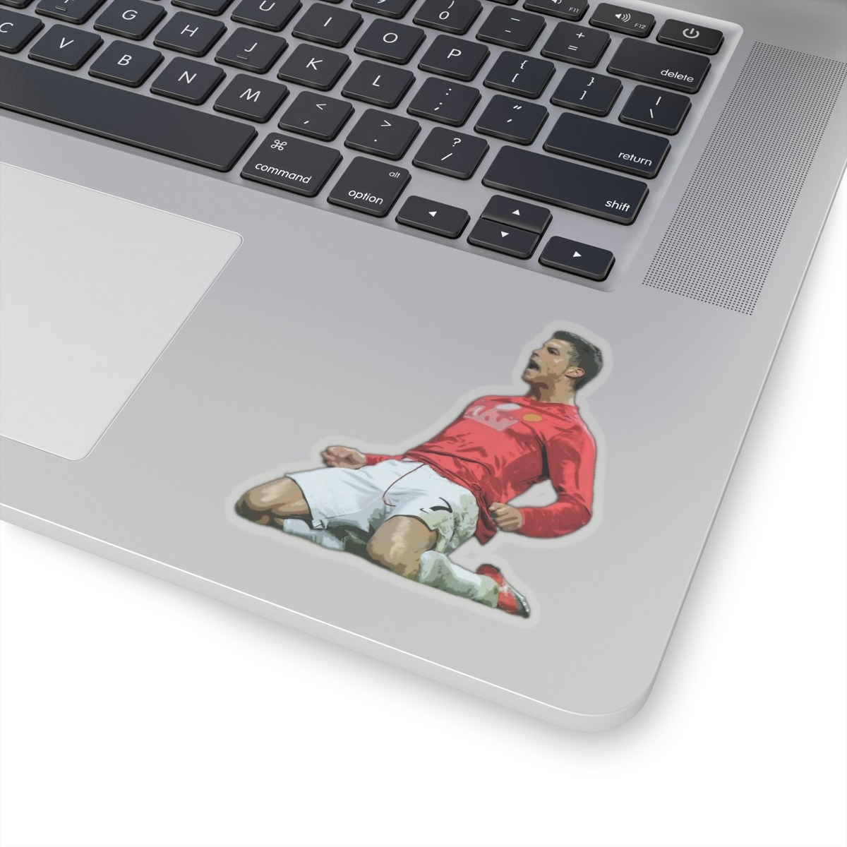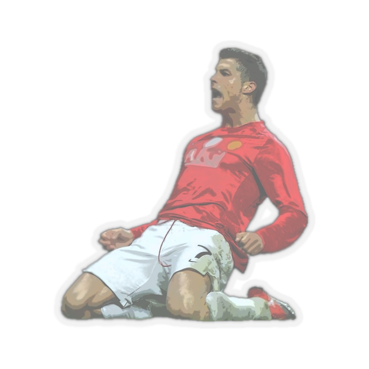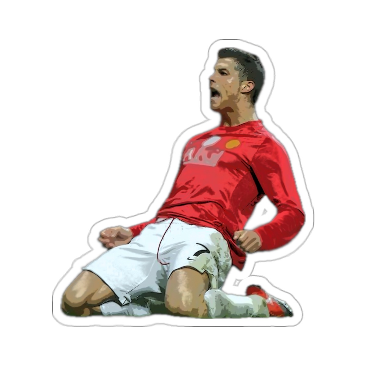 This is a Cristiano Ronaldo Slide Celebration Kiss-Cut Sticker. This was when Cristiano Ronaldo celebrated after scoring a goal for Manchester United. A kiss-cut provides you with the ultimate flexibility for implementing your vision—this method cuts the sticker into any shape you desire, while leaving the back intact so that it can be smoothly peeled off the page.