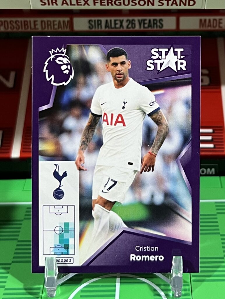 Description: Cristian Romero Stat Star card from the 2024 Panini Premier League sticker collection
